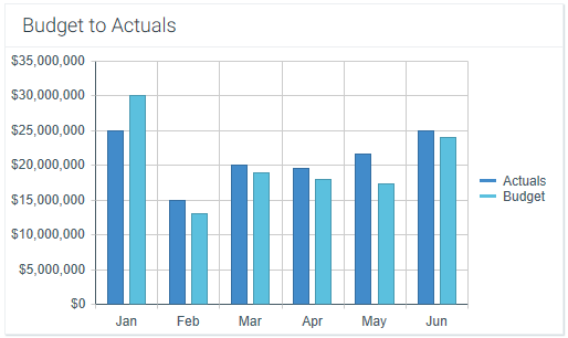 The Axiom form could contain a column chart that shows budget and actuals data by month. If you want users to be able to see the details about the data in any particular month, you could set up a second chart that references the selected label and series of the first chart. For example, if the user selects the Budget column for February in the first chart, the second chart will be updated to show detailed budget data for February. The second chart could support additional interactivity so that the Axiom form user can decide how they want to view this detailed budget data (for example, broken out by account category or by department regions).
