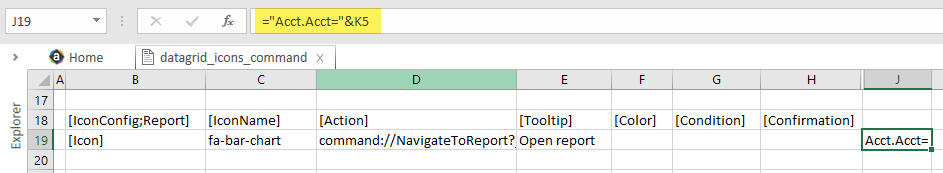 Cell Report!J19 creates a filter criteria statement that references the Acct.Acct value in the ActionRowColumn. When the user clicks on the row for Acct 6000, the cell contents will be Acct.Acct=6000. This filter is then applied to the target document when it is opened.