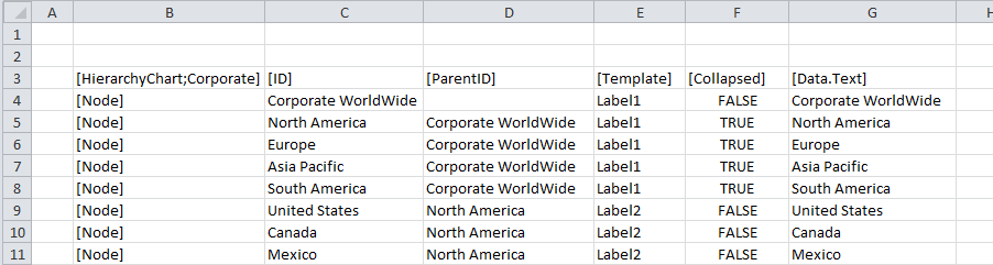 The following example shows a simple hierarchy flagged in a sheet. In real implementations this data might be generated by an Axiom query or Axiom functions; here the data is simply typed in order to show the placement of the tags to the data.
