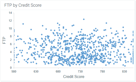 NOTE: This chart uses the default marker shape and size. The labels for the X-Axis and Y-Axis ("FTP" and "Credit Score") are defined in the component properties, not in the data source.