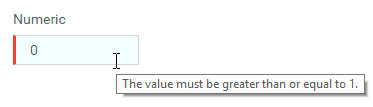 Users can type numbers into the text box. If the number does not fall within the defined minimum and maximum range, a red validation bar displays in the text box, and the tooltip displays a validation message.