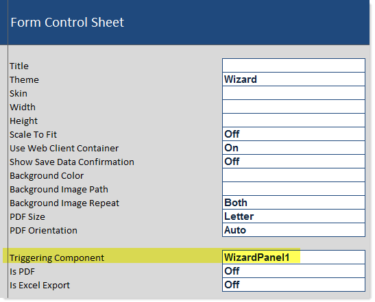 When an update is triggered for an Axiom form, Axiom writes the name of the specific component that triggered the update into the Triggering Component cell at the top of the Form Control Sheet.