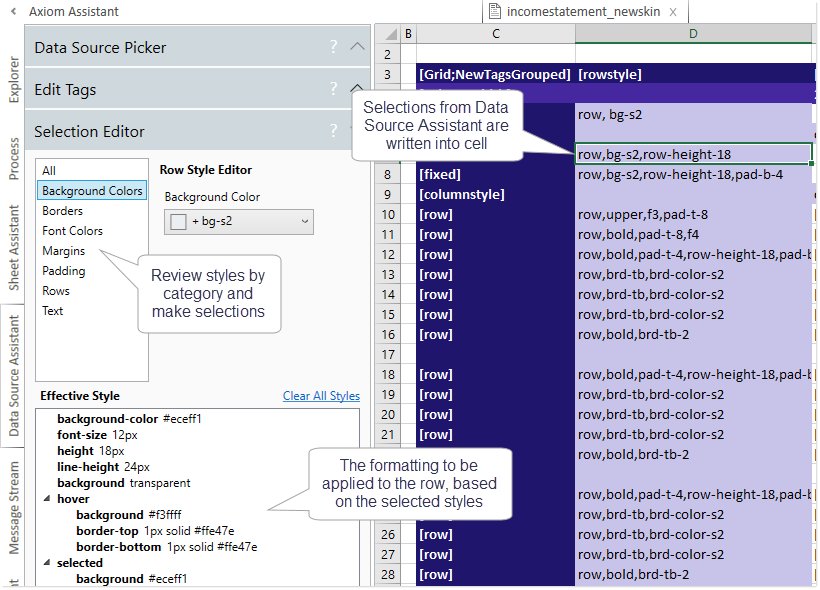 You can type style names manually, or you can use the Data Source Assistant to see the available style names and populate the current cell. It is strongly recommended to use the Data Source Assistant to apply styles, both to ensure that you are using correct style names and syntax, and because the Data Source Assistant provides an easy way to view all style options. For more information on using the Data Source Assistant, see Using the Data Source Assistant to apply row and column styles.