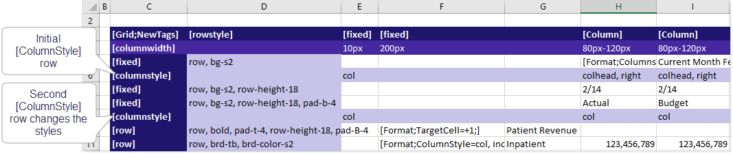 The following example screenshot shows a formatted grid with two [ColumnStyle] rows. In this example, columns H and I start out using the colhead style, but then later change to the col style. This is to display column header shading and bold in the first few rows, but then revert to "normal" column formatting afterward. You can have as many [ColumnStyle] rows in the grid as needed.