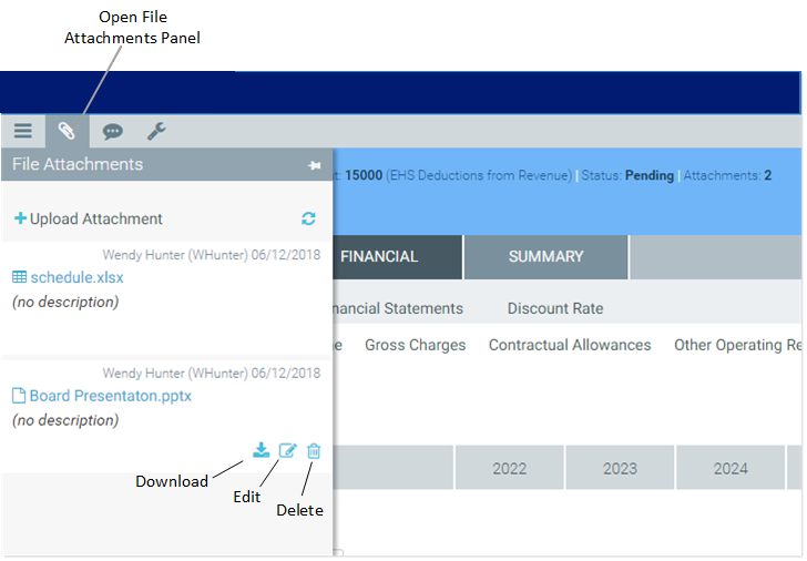 To open the File Attachments panel, users can click the attachments icon in the Task Bar The gray bar that displays across the top of browser-based Axiom files, as well as various feature pages of the Web Client. The Task Bar provides access to various tasks that are specific to the current area, page, or document.. If the plan file already has attachments, those attachments display in the panel.