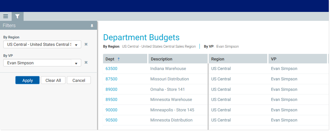 [Value]column for the data source must contain valid filter criteria statements based on the plan code table. The selected filter is applied to the web page "as is". The[Label]column of the data source can contain "user friendly" text instead of the full filter statement. - All other refresh variable settings can be used in this context, such as dependent variables or group names. Keep in mind that if you configure a variable as required, then once a user selects a value for that variable and applies it, they will not be able to clear the variable and return to the unfiltered state of the report without reloading the page.
