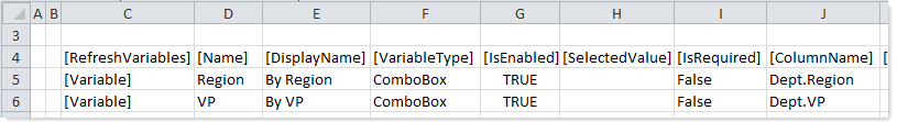 The variables file can use Axiom queries, data lookups, and Axiom functions to define the variable properties or to populate the ComboBox data source. When the file is accessed by the web page, any "refresh on open" queries are executed and formulas are calculated before the variables are read from the file and presented in the Filters panel. When a user applies the variable values, the file is refreshed and calculated again before the final selected values are applied as filters to the web page. The file should not contain any queries or other features that are not necessary to the configuration of the refresh variables.
