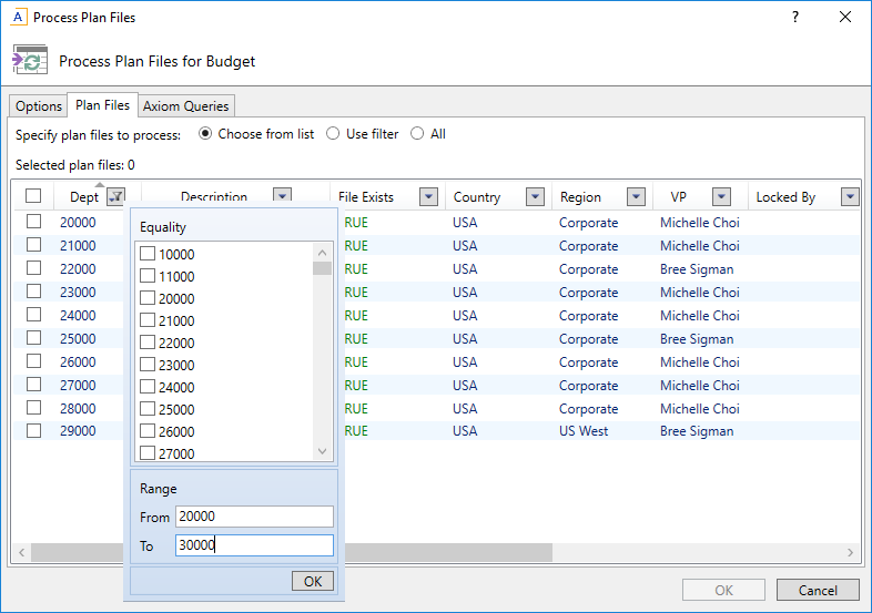 - Range: Specify a range of values to show items that fall within the range (inclusive). For example, to display all departments from 20000 to 30000.
