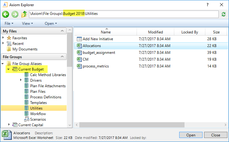 For example, in the following screenshot, the file group alias Current Budget is expanded. Because the alias currently points to the file group Budget 2018, the folders and files under the alias are from Budget 2018. When you select a file or folder, you can see the real file path in the top of Axiom Explorer.