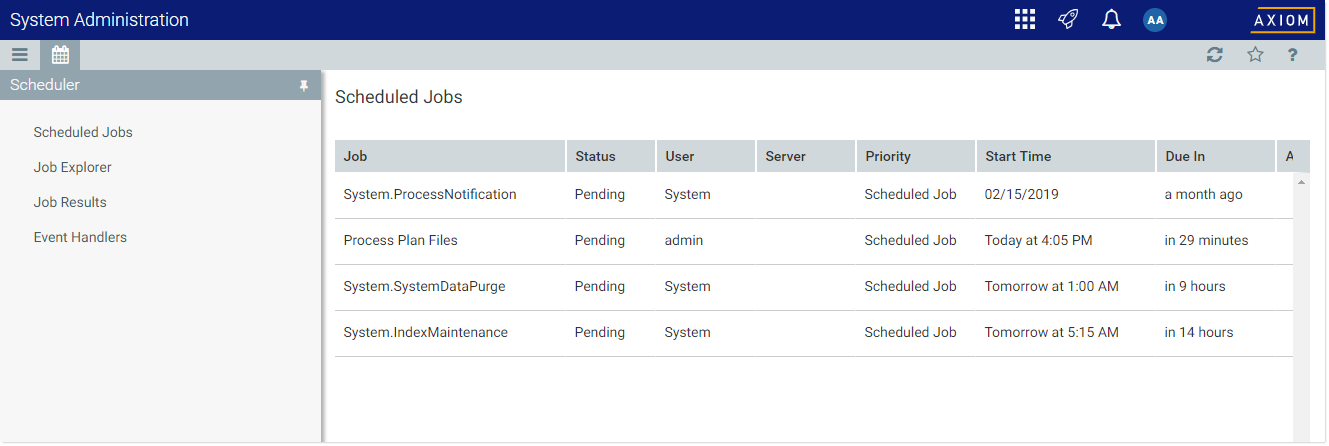 The Scheduler area of the Web Client can be used to monitor and manage the job schedule, review job results, and process existing jobs on demand. Only administrators and users with the Scheduled Jobs User permission can access Scheduler.