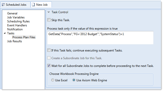 You can enter any expression that would be valid in an IF function. You can use Excel functions, Axiom functions, and Scheduler job variables in the expression. If you use a job variable, it must be placed in quotation marks unless you expect the variable value to be resolved and evaluated as a number.