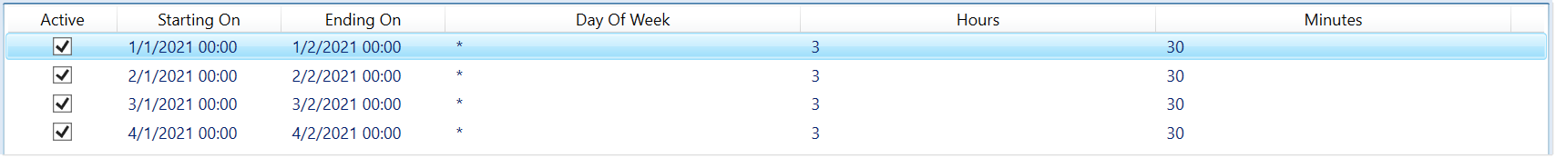 | Schedule | Start/End | Day of Week | Hours | Minutes |