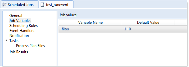 When using RunEvent to execute a Scheduler job, you can pass a variable value to the job. For example, imagine that you want to execute a Process Plan Files job, and you want to send a filter value to the job.