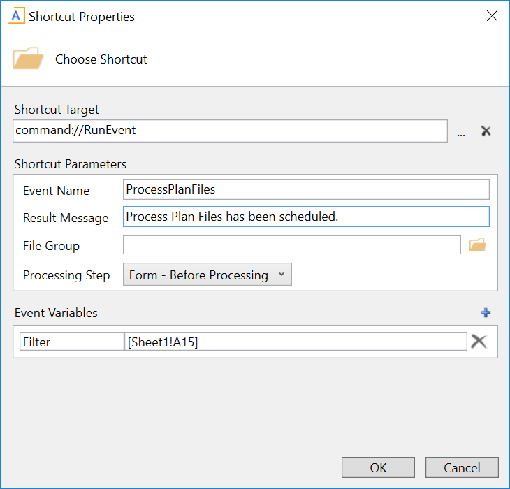 NOTE: In this case, we have defined a default value for the filter variable (1=0) that does not result in any plan files. This is because we do not want to process any plan files unless a filter is provided by RunEvent. If we left the default value blank, that would mean all plan files would be processed if no filter was provided by RunEvent.