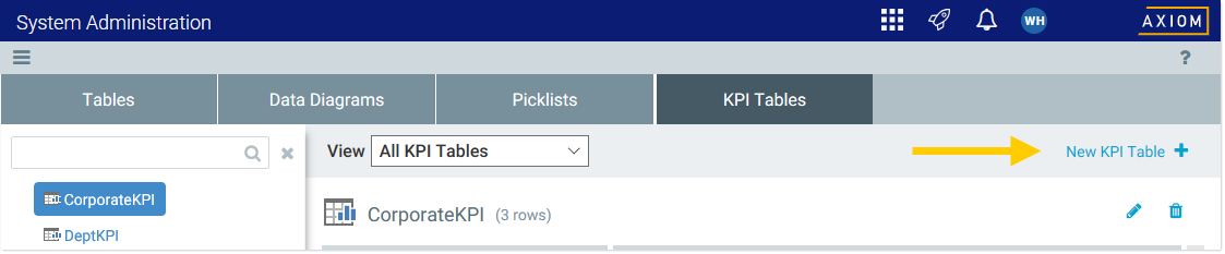 You can create new KPI tables as needed. Only administrators and users with the Administer Tables security permission can create new KPI Tables.