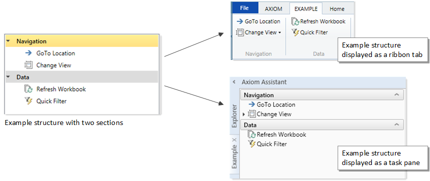 Task panes and ribbon tabs are stored as AXL files in the Task Panes Library and in the Ribbon Tabs Library respectively. Task panes and ribbon tabs are created in a very similar manner. Both use a multi-level structure, with top-level "sections" that can contain one or more child items.