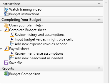 The following is an example task pane that could be made for end users to complete their budgets. Although it would be possible to do this as a ribbon tab, use of text instruction for a process is better suited for a task pane.