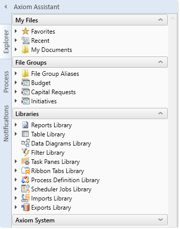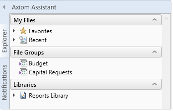 Axiom provides a built-in Explorer task pane to provide users with quick access to their favorites, recent items, and all Axiom files that they have rights to access. By default, all users are given access to this task pane. If desired, you can disable use of this task pane entirely, or restrict access to certain sets of users.