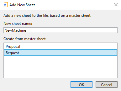 New sheet name: Type the name of the new sheet. This name cannot be the same as any other sheet in the workbook, including the master sheets. It is recommended to avoid spaces and special characters in the name.