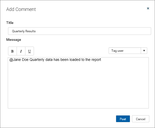 When you click Post, the comment is saved to the message stream, and any tagged users will be notified.