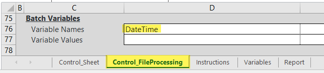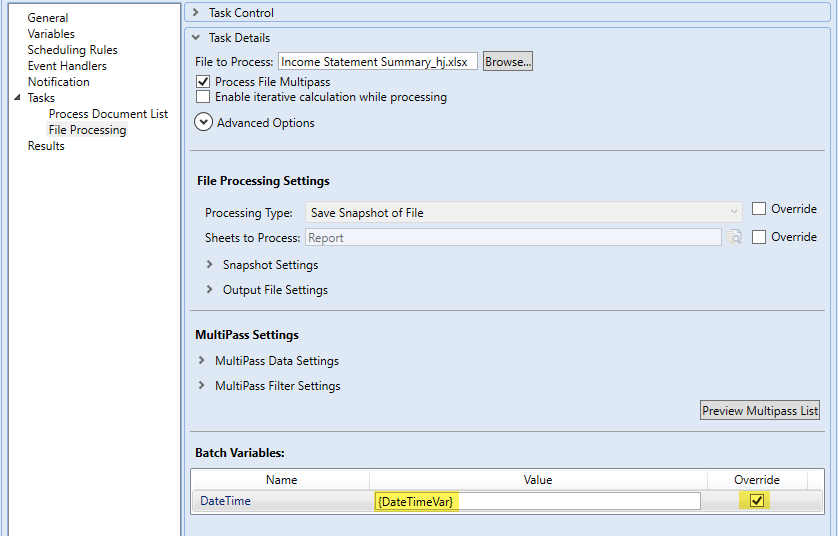 When the job is run, the DateTimeVar job variable is set to the date-time value passed from the DateTimeStamp report. The DateTime batch variable is then set to this date-time value, and passed into the income statement report by placing the value in cell D77. The file processing action then uses this batch variable value as the file is processed