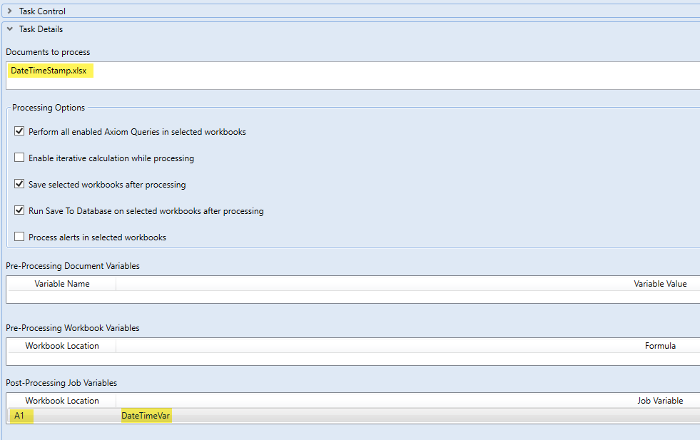 In this example, the value created in cell A1 of the DateTimeStamp report is passed to the DateTimeVar job variable.