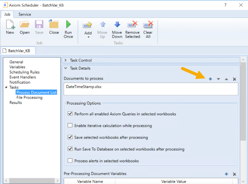 In the Task Details section, click the Add button and select the DateTimeStamp report from Axiom Explorer.