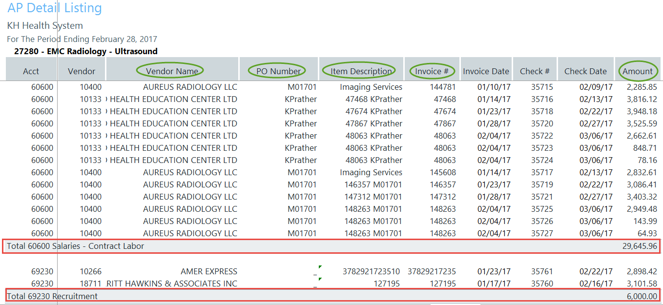 Review the Summary Level information, then look to the detail for further explanation regarding variances. Determining the account numbers with variances will provide the link to the detailed information on the AP, AR, MM, etc. reports that support the expense. As in our example above, Salaries and Other Expenses resulted in a Red Flag Variance, specifically within accounts 60600 Salaries-Contract Labor and 69230-Recruitment.