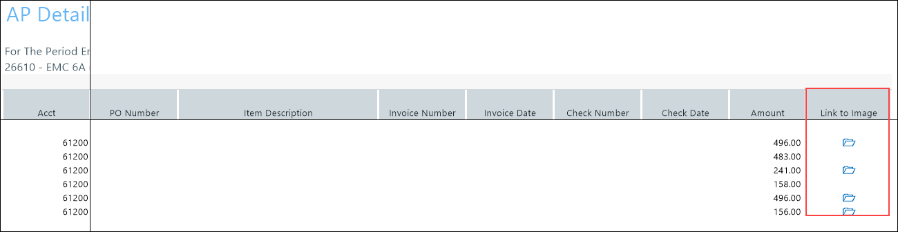 AP transactions may include links to supporting documentation. In the Link to Image column, click the folder to open the document image.