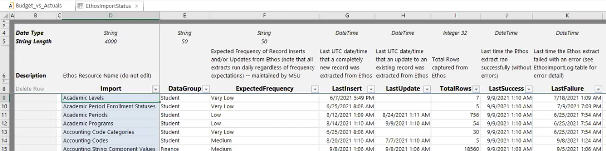In the LastSuccess column, review the date and time the an Ethos extract last ran successfully. This should match the last time you ran an import of the table listed in the associated Import column.