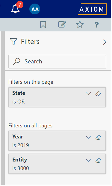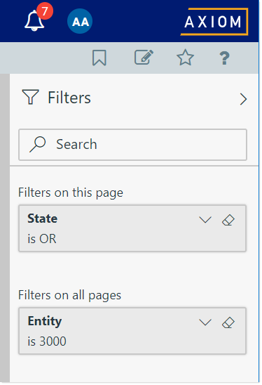 Filters that are used often in Axiom Intelligence reports can be saved to the centralized Filter Library for reuse. Once a filter has been saved, you can open any Axiom Intelligence report and apply the filter to that report.