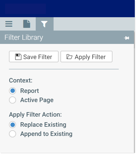 In the Filter Library panel, review and set the Context to specify which report filters will be saved to the Filter Library: