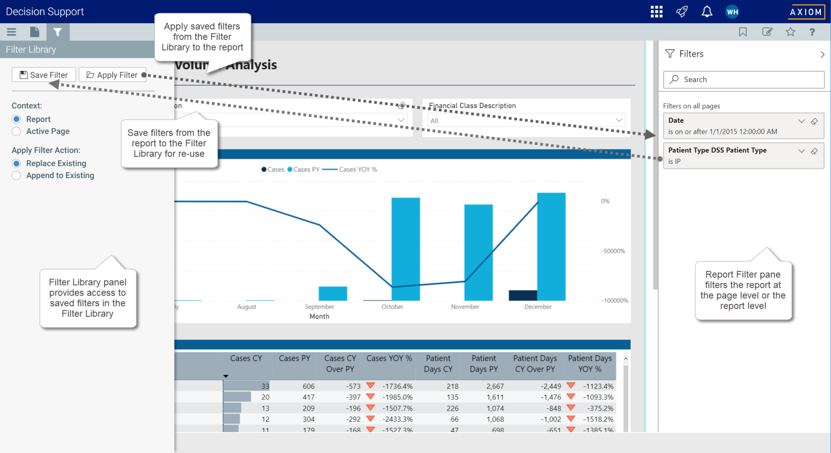 While you are in an Axiom Intelligence report, you can apply a saved filter in the Filter Library to that report. When applying a saved filter, you can choose to apply it at the page level or the report level, and you can choose whether to overwrite existing filters or append to existing filters. The data in the page or report is then refreshed according to the applied filter.