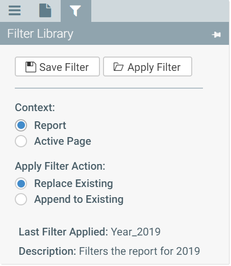 Then, you use the Filter Library panel to apply a filter. The Filter Library panel is currently configured as Context=Report and Apply Filter Action=Replace Existing. Your selected filter therefore overwrites the current report-level filter, so that the previous Year filter is now replaced by an Entity filter.