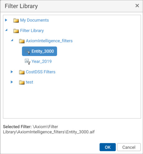 This dialog shows all Axiom Intelligence filters that you have rights to access, as determined by your security permissions to the Filter Library.