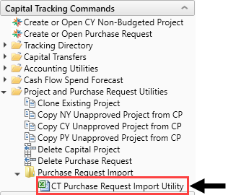 In the Cap Plan Admin task pane, in the Capital Tracking and Commands section, click Project and Purchase Request Utilities > Purchase Request Import, and double-click CT Purchase Request Import Utility.