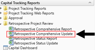 In the Cap Track or Cap Track Admin task pane, in the Capital Tracking Reports section, click Retrospective Project Review, and double-click Retrospective Comprehensive Report.