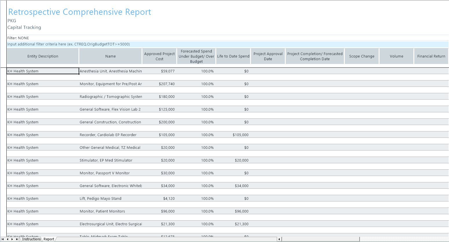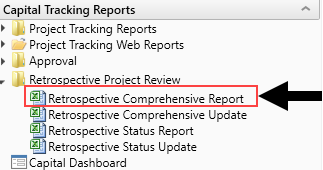 1. In the Cap Track or Cap Track Admin task pane, in the Capital Tracking Reports section, click Retrospective Project Review, and double-click Retrospective Comprehensive Report.