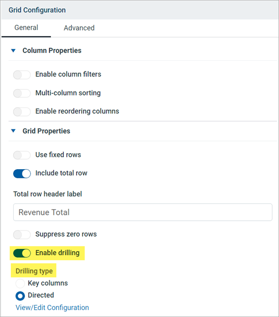 - On the General tab of the Grid Configuration properties, enable Enable Drilling.
