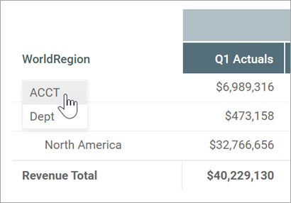 - The row dimension(s) of the original report are removed from the grid and replaced with the current drill column. The drill column is either the current column of a directed drilling path, or the selected key column.