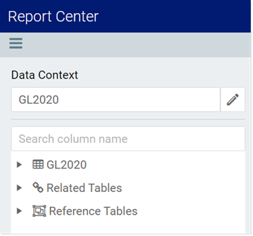 In this example, we have selected GL2020 as the primary table. GL2020 is a data table that looks up to reference tables Dept and Acct. The table tree is populated as follows: