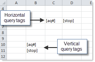 The insert control column or row must contain at least one set of data range tags, to specify where the data should be placed in the sheet. To define a data range on the sheet, enter the following tags into consecutive cells within the insert control column or the insert control row (depending on the orientation of the query):