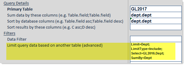 Within this field, you enter special syntax to define the parameters of the limit query. In this example, the Axiom query is querying data from GL2017. We want to limit the data in the Axiom query to only those departments that are also used in the GL2016 table. The syntax used in the limit query setting identifies the following: