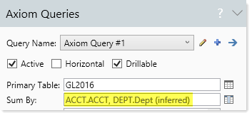 Each Axiom query must have a specified "sum level" that determines the level of summation for the rows in the query. To specify the sum level, list one or more columns in the Sum By setting in the Sheet Assistant.