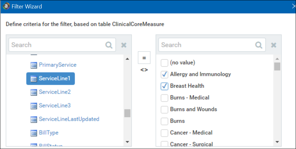 - In the right side of the dialog, type or select the value on which to base the filter. You can type into the field above the list of values to filter the list or to specify a value. If one or more values are selected, then those items are used in the filter. Otherwise, whatever you type into the field is used by the filter.