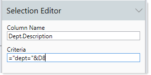 To edit an existing data lookup row, place your cursor within the row, in the data source—either on the row tag or in one of the parameter columns. The parameters for the variable display in the Selection Editor section of the Data Source Assistant, filtered by row type. You can modify any of these parameters and the changes are written back to the sheet, into the appropriate columns.