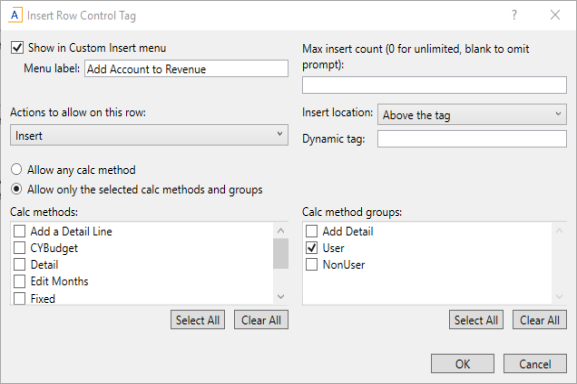 • Specify the calc methods that can be used to insert or change on a particular row. Calc methods can be specified by individual calc method name and by calc method group.
