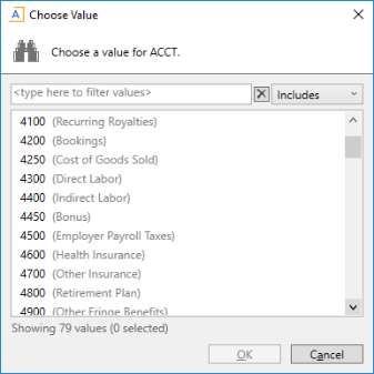 • A dialog box presents the user with a list of accounts (or any desired dimension). The account list can be filtered so that the user only has to choose from accounts that are relevant to the plan.