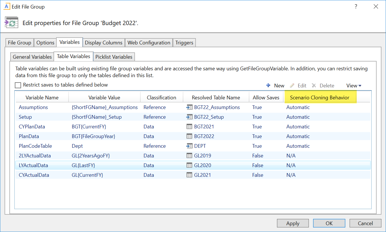 If the file group has table variables for other dimension reference tables besides the plan code table, these tables probably should not be cloned for the scenario. For example, if a table variable references an Entity table or an Account table, there is likely no need to create a copy of this table for the scenario.
