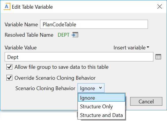 NOTE: If you ever want to restore the table variable to the default scenario cloning behavior, simply edit the variable to clear the Override Scenario Cloning Behavior check box.